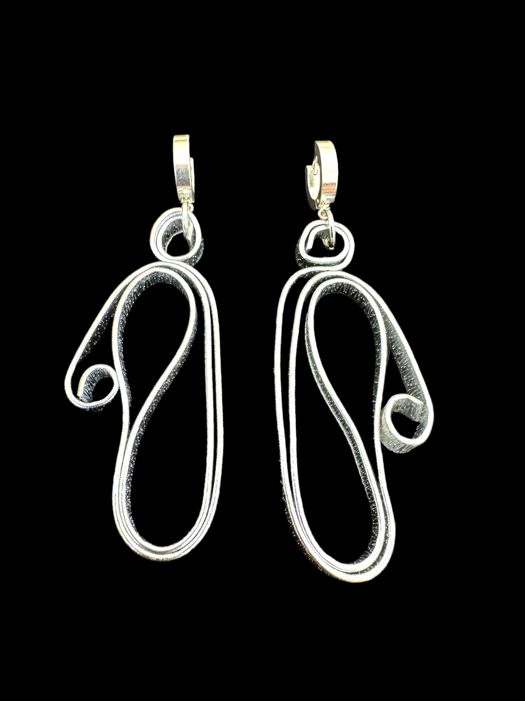 Silver Abstract Shape Earrings -Wearable Art piece - Designed from textured non-tarnished Aluminum wire. - 2 1/2 inches long. - On stylish hoops that are secure.