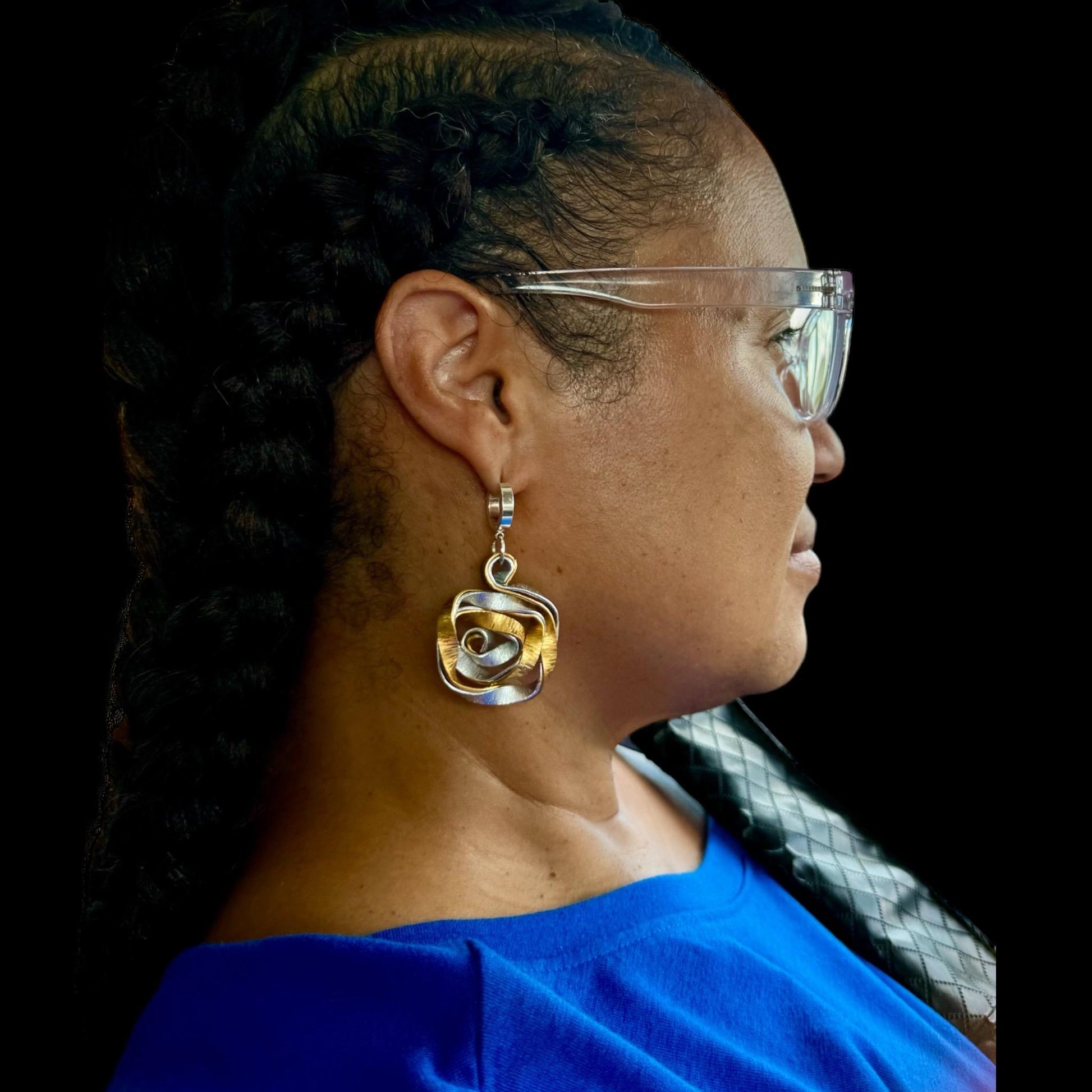 Silver Gold Twisted Spiral Earrings - Wearable Art piece - Designed from textured non-tarnished Aluminum wire. - 1 3/4 inches long. - On stylish hoops that are secure.